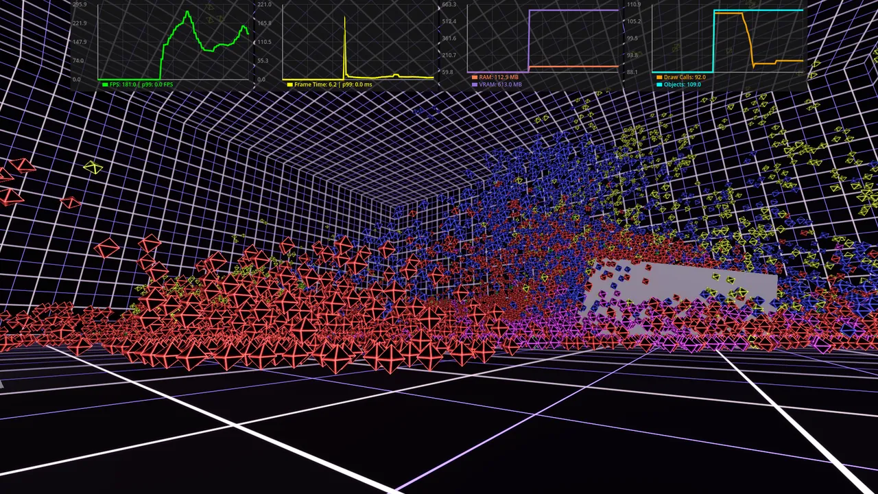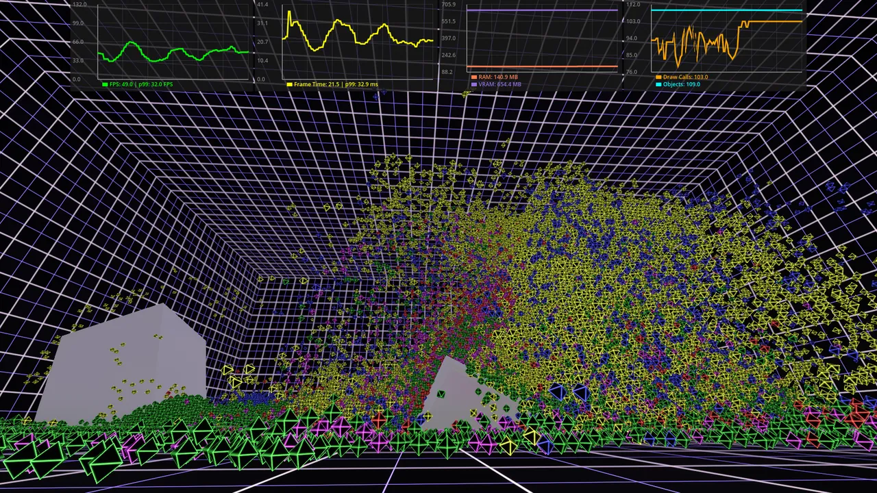 In practice, performance can be improved dramatically a few ways. Simply having entities outside the camera's field of view dramatically increases performance as real-time occlusion culling is impractical and essentially unused, though I am exploring some ideas to reuse the hard surface collisions planes for this. Additionally, reducing the number of entities to a more manageable number for gameplay, such as 15,000 entities, increases performance to well above typical monitor refresh rates when V-Sync is disabled.